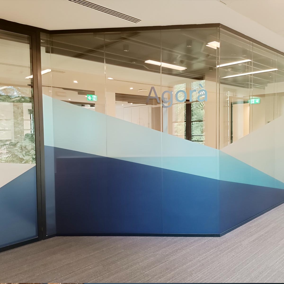 Per creare un ambiente più moderne alcune vetrate sono state decorate con della pellicola satinata e stampata per donare colore e dinamismo agli uffici